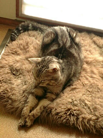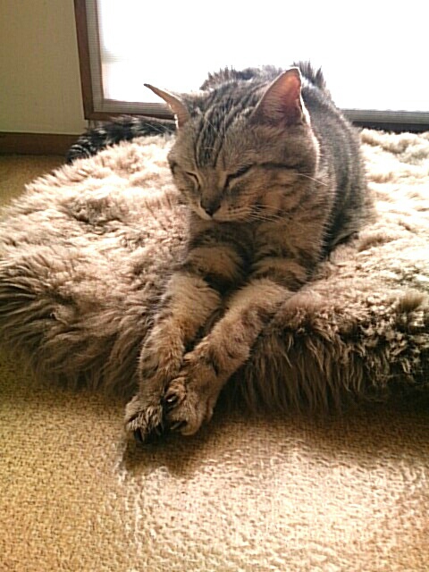 いつもは日向ぼっこなんかしない絹志郎、ムートンの座布団を置いてやったら……