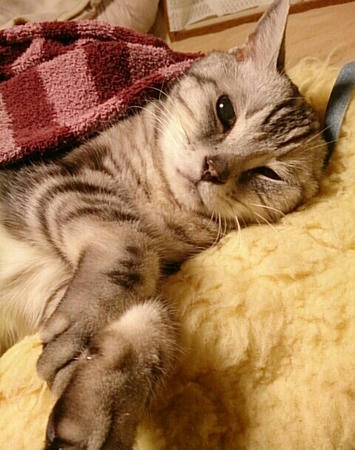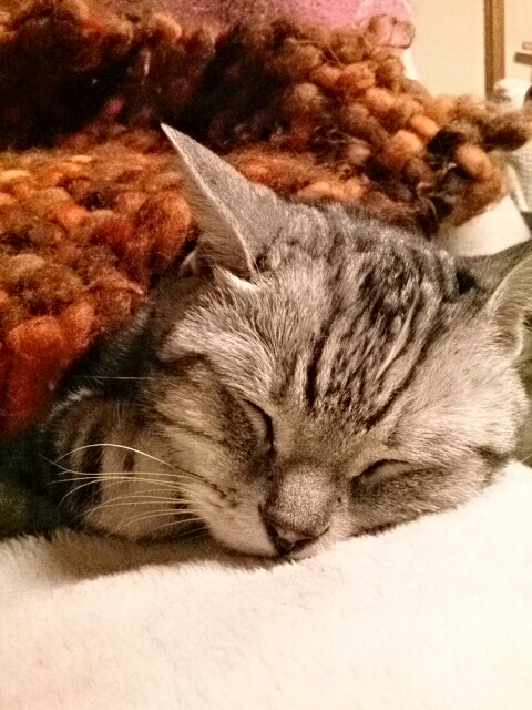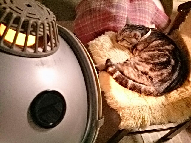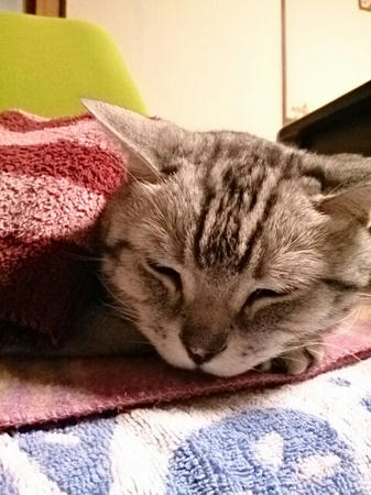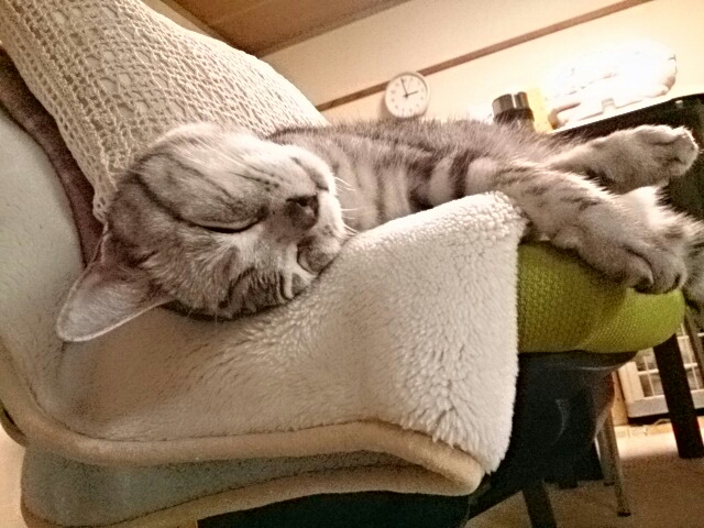 絹志朗は昨日もちょっと足がふらついてたけど、まあまあ食べて、ゴロゴロ言って、寝てました。